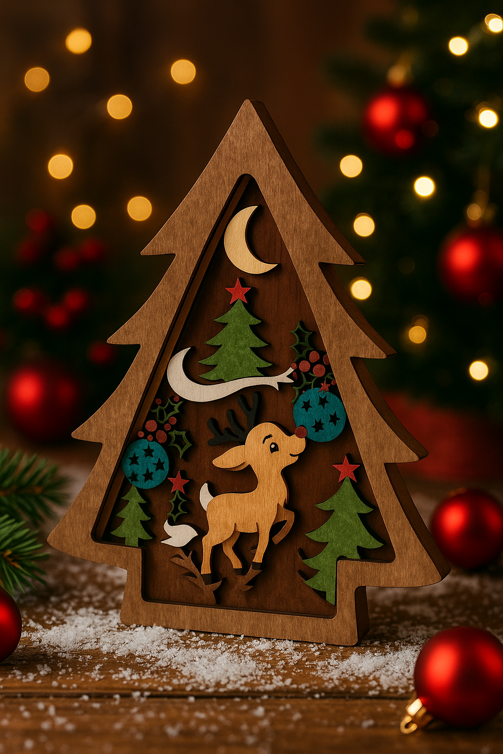 Dieser liebevoll gestaltete Holz-Weihnachtsbaum bringt warmes, festliches Licht in dein Zuhause. Das detailreiche Rentiermotiv mit Tannen, Sternen und Mondsichel ist in mehreren Ebenen gelasert und erzeugt so einen wunderschönen 3D-Effekt. Im Inneren sorgt eine integrierte LED-Beleuchtung für eine gemütliche, goldene Stimmung – perfekt für Fensterbank, Kommode oder festlich gedeckten Tisch.